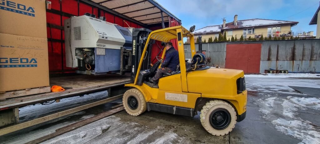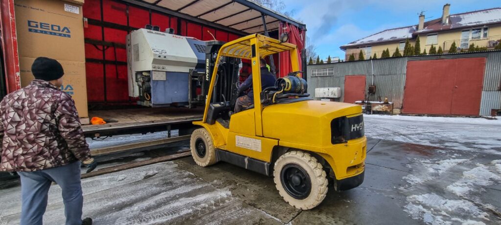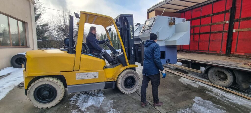 A w galerii wózek widłowy Hyster 5 t. realizujący rozładunek ciężkich maszyn.