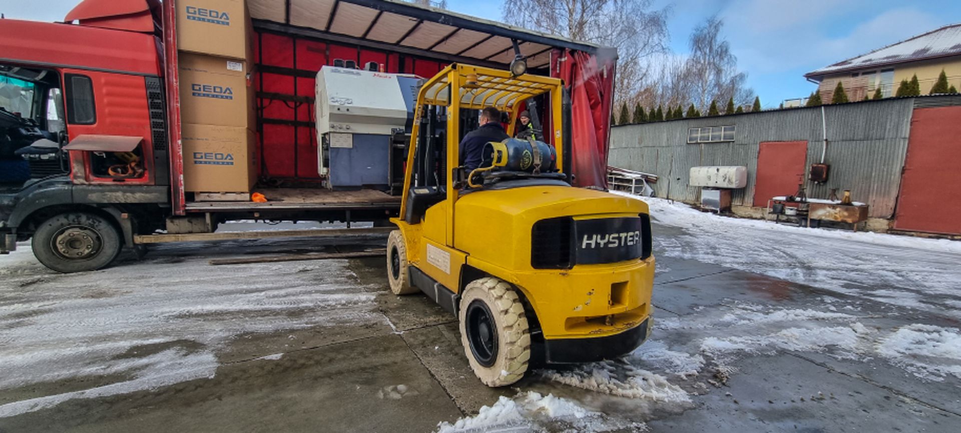 A w galerii wózek widłowy Hyster 5 t. realizujący rozładunek ciężkich maszyn.